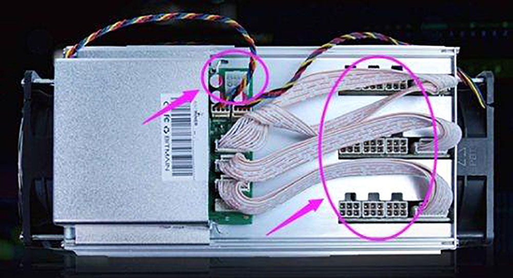 Then connect the power cable and the various ports of the miner's power supply to the miner. The power supply has 10 power ports, which are respectively connected to the control board and the hash board. After all the cables are connected, the power supply can be powered on. The miner's light starts to light up, and the miner can operate normally.